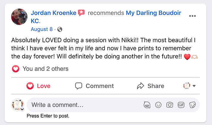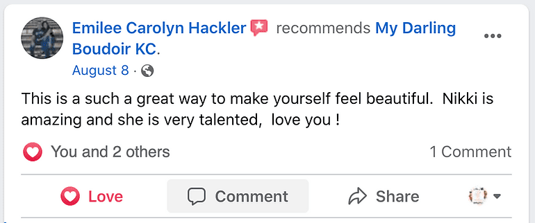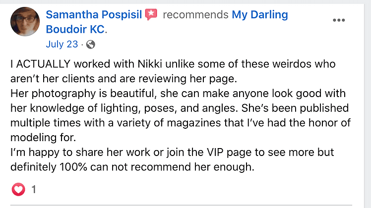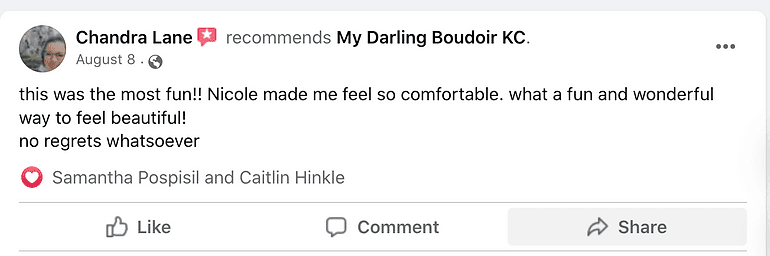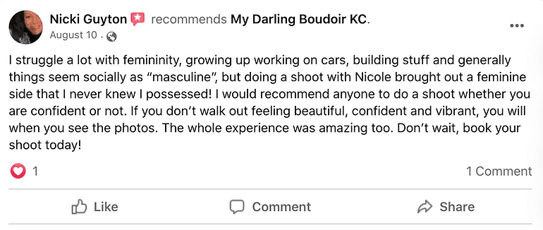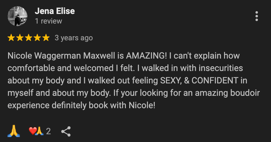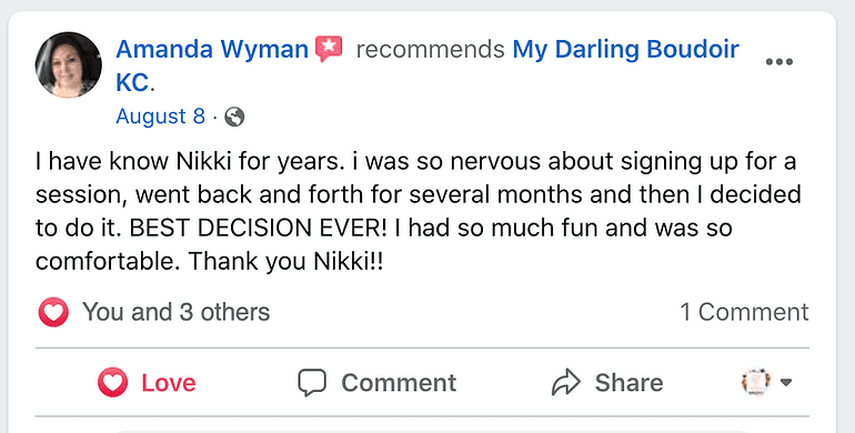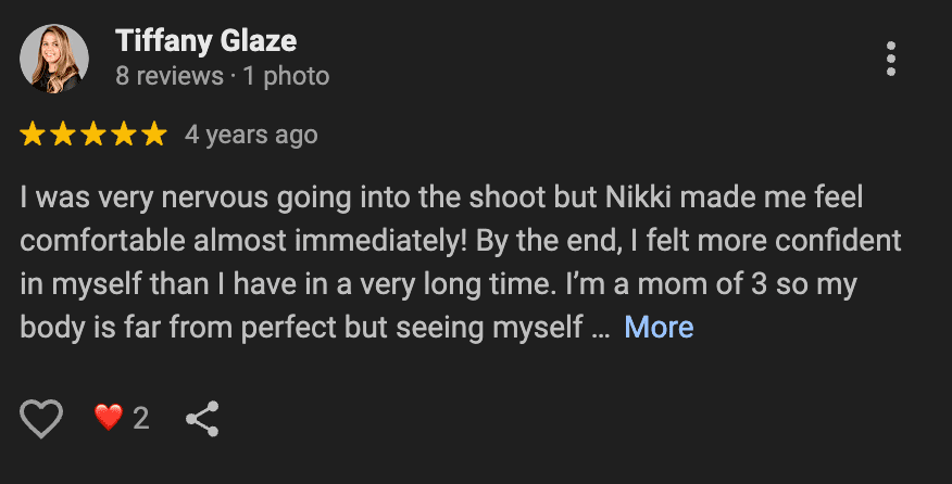 "Do it! It’s so worth it to see yourself from someone else’s point of view and have confidence again! You won’t regret it because Nikki makes everyone I’ve seen so far look amazing."