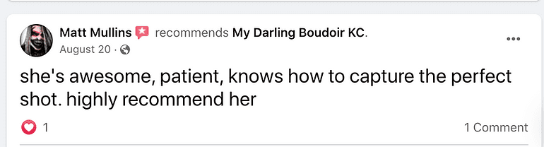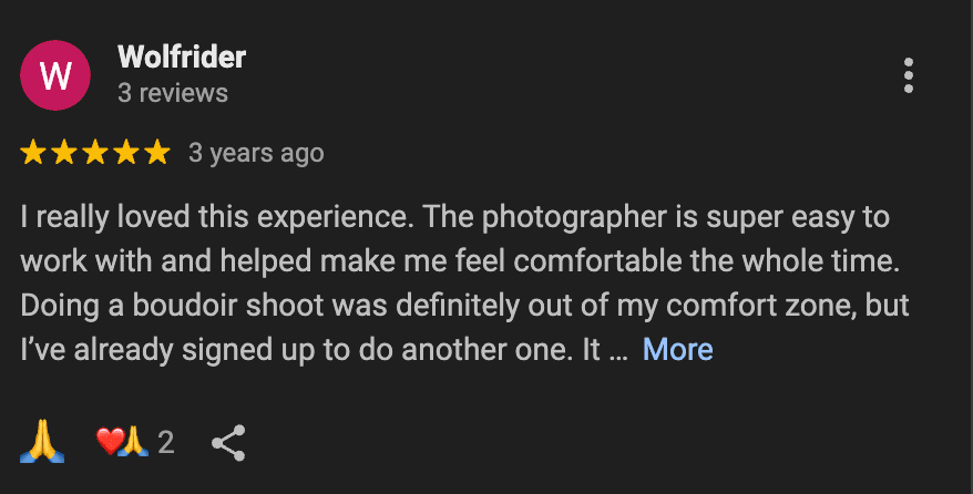 "I actually have recommended you to a few friends and I’ve told them you made me feel comfortable and it was so much fun and the end result of the pictures made me feel beautiful and sexy!"