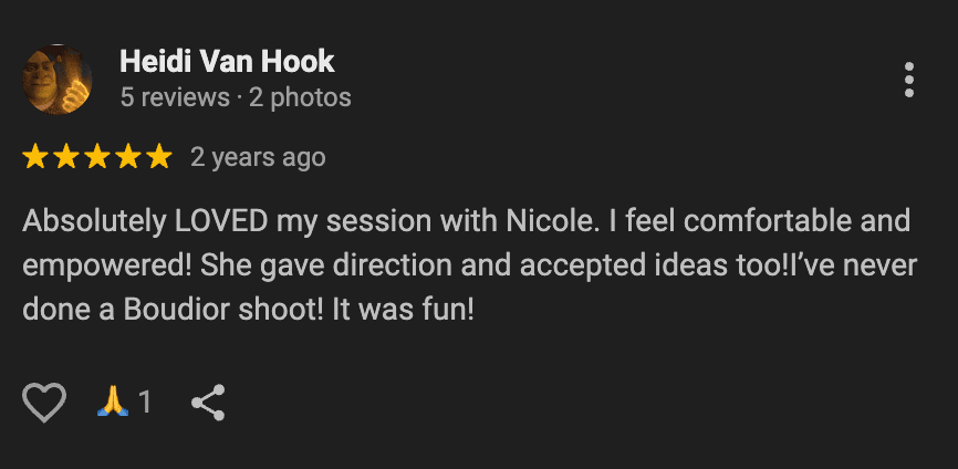 "this was the most fun!! Nicole made me feel so comfortable. what a fun and wonderful way to feel beautiful! no regrets whatsoever."